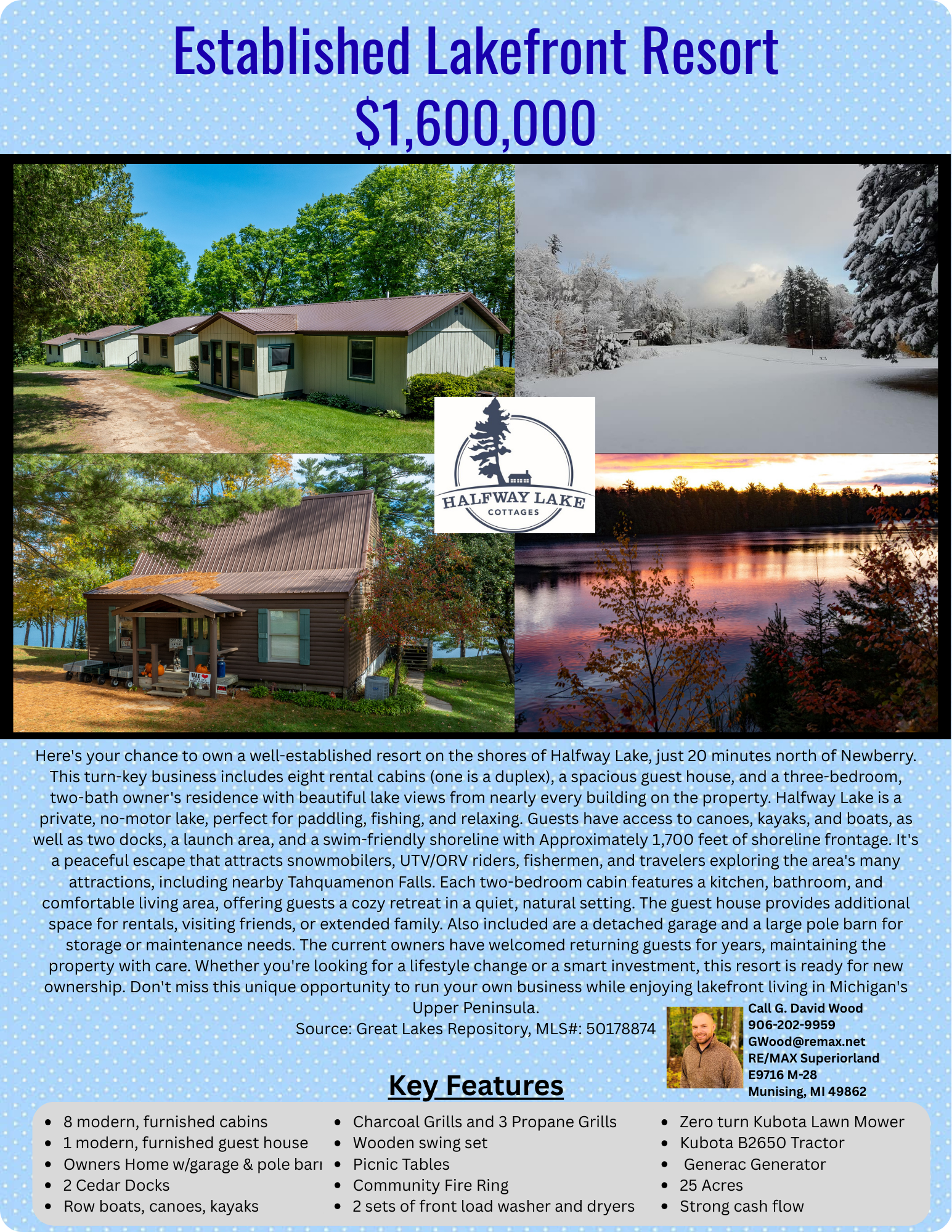 Experience the beauty, peace and tranquility of the great north woods on Halfway Lake, a 65 acre private lake encompassed by a woodland setting. Fall asleep listening to nesting loons call; sip coffee from your porch while watching an eagle catch breakfast. Our nine modern lakeside cottages offer lodging for a secluded getaway with the conveniences of home. Centrally located in Michigan’s Eastern Upper Peninsula, Halfway Lake Cottages provides a home away from home, as an ideal focal point to major attractions such as Tahquamenon Falls , Pictured Rocks, The Soo Locks, and Oswald’s Bear Ranch. If you prefer to stay close to home, this area is known for some of Michigan’s best fishing, hunting, rock hounding and snowmobiling.